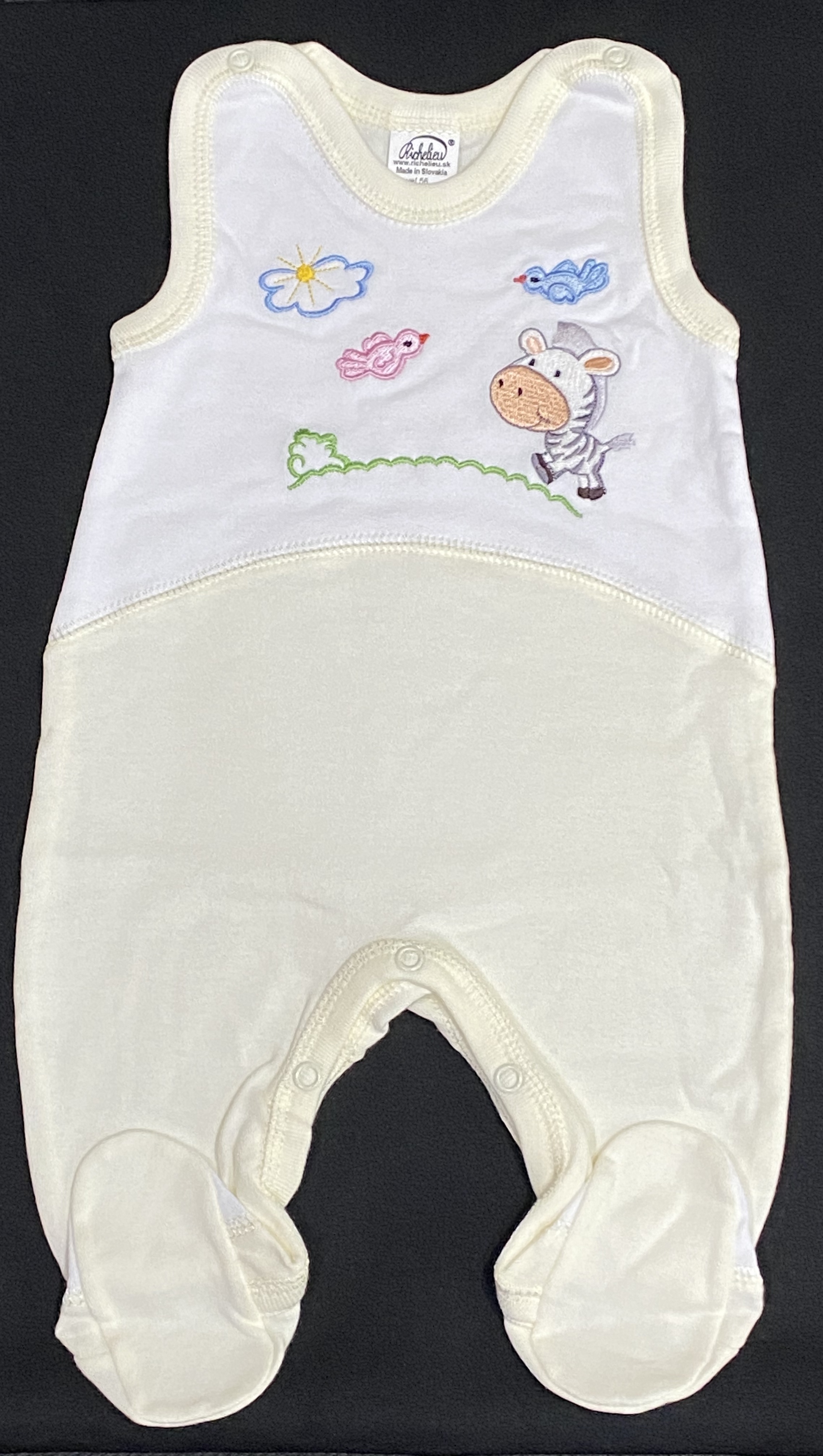 Jednoduché balvnené dupačky so zapínaním na vnútornej strane nožičiek a na pleciach s výšivkou zebry.