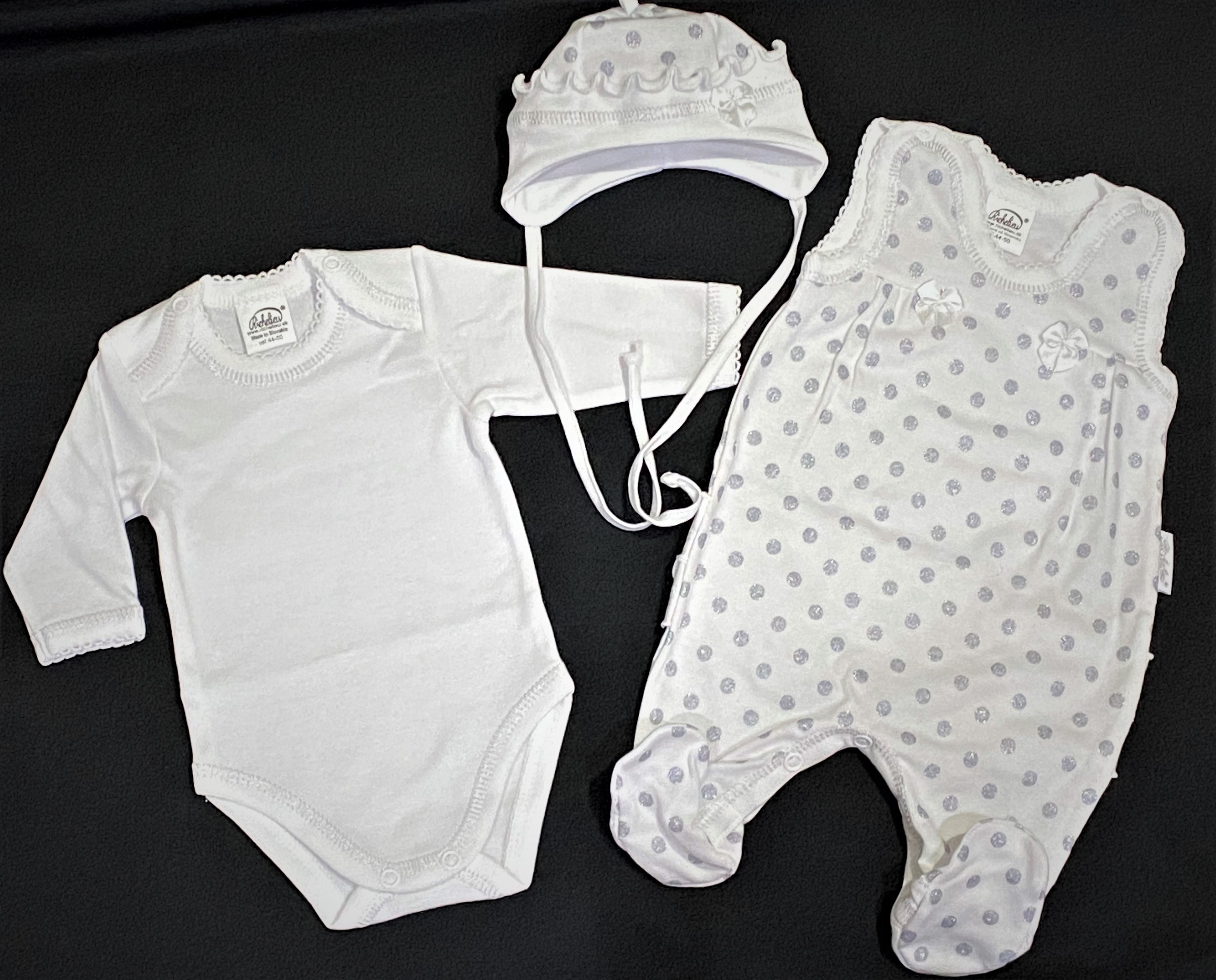 Krásna, čisto bavlnená biela súprava so striebornými bodkami, do ktorej sa ihneď zaľúbite. Detailné prepracovanie, jednoduchý a kvalitný strih. Súprava tvoria body so zapínaním na pliecku, dupačky s fodričkovou dupou :-) a čiapka na viazanie.