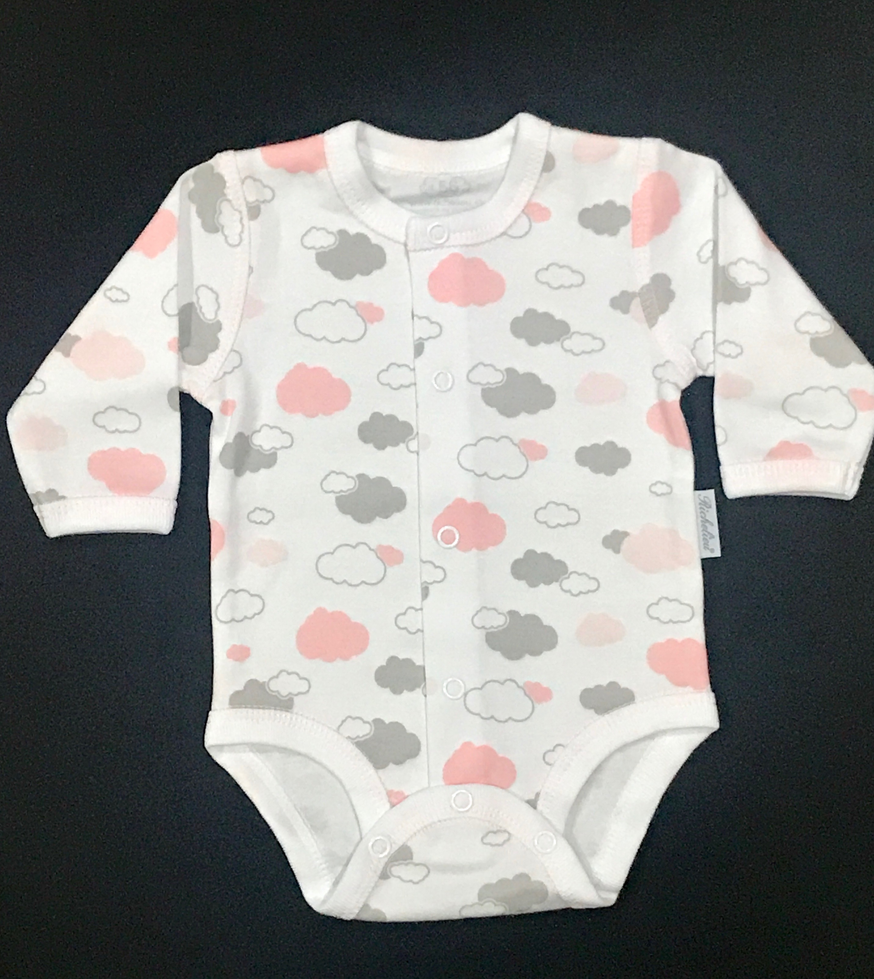 Bavlnené body s potlačou mrakov, zapínaním na patentky od krku až k rozkroku.