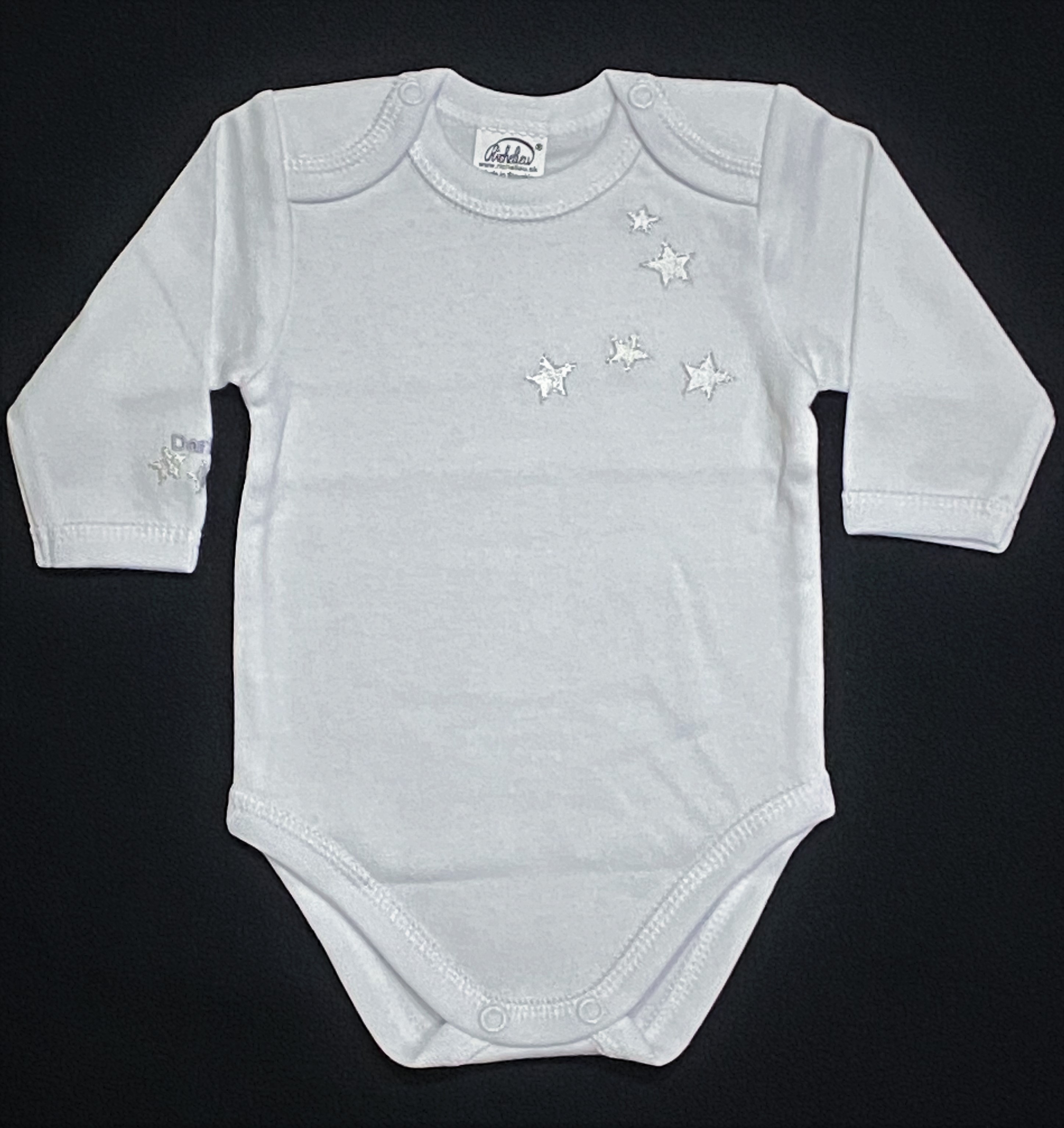 Bavlnené jednofarebné body s výšivkou hviezdičiek (aj na rukáve) so zapínaním medzi nôžkami a na pleciach.