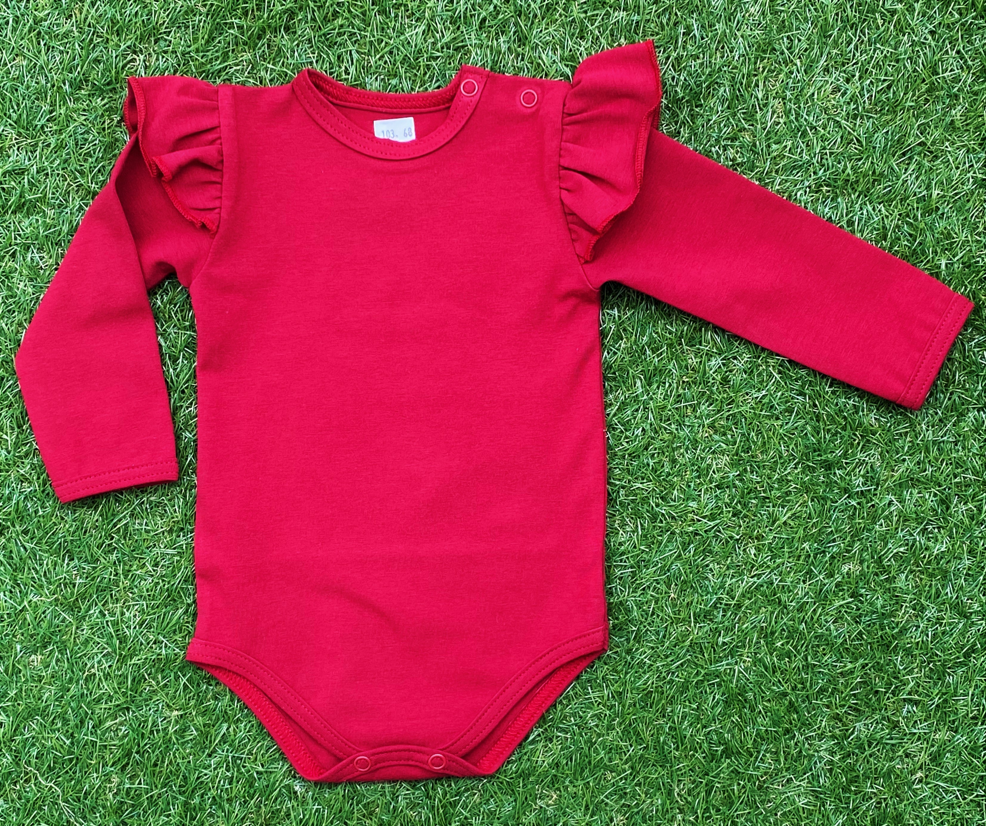 Jednoduché bavlnené body, ktoré pôsobia vďaka volánom na plieckach slávnostne. Zapínanie je medzi nohami a na jednom pleci.