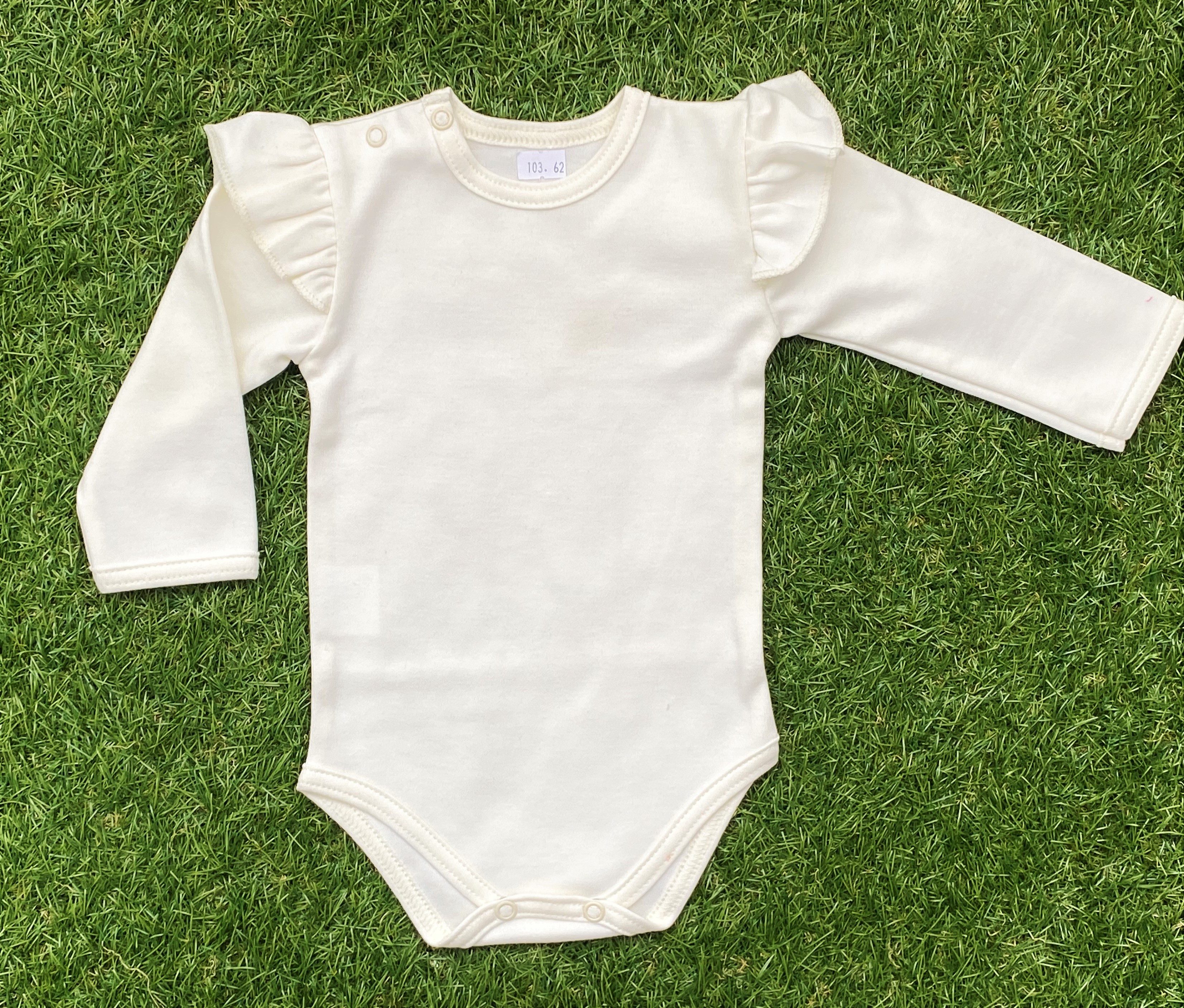 Jednoduché bavlnené body, ktoré pôsobia vďaka volánom na plieckach slávnostne. Zapínanie je medzi nohami a na jednom pleci.