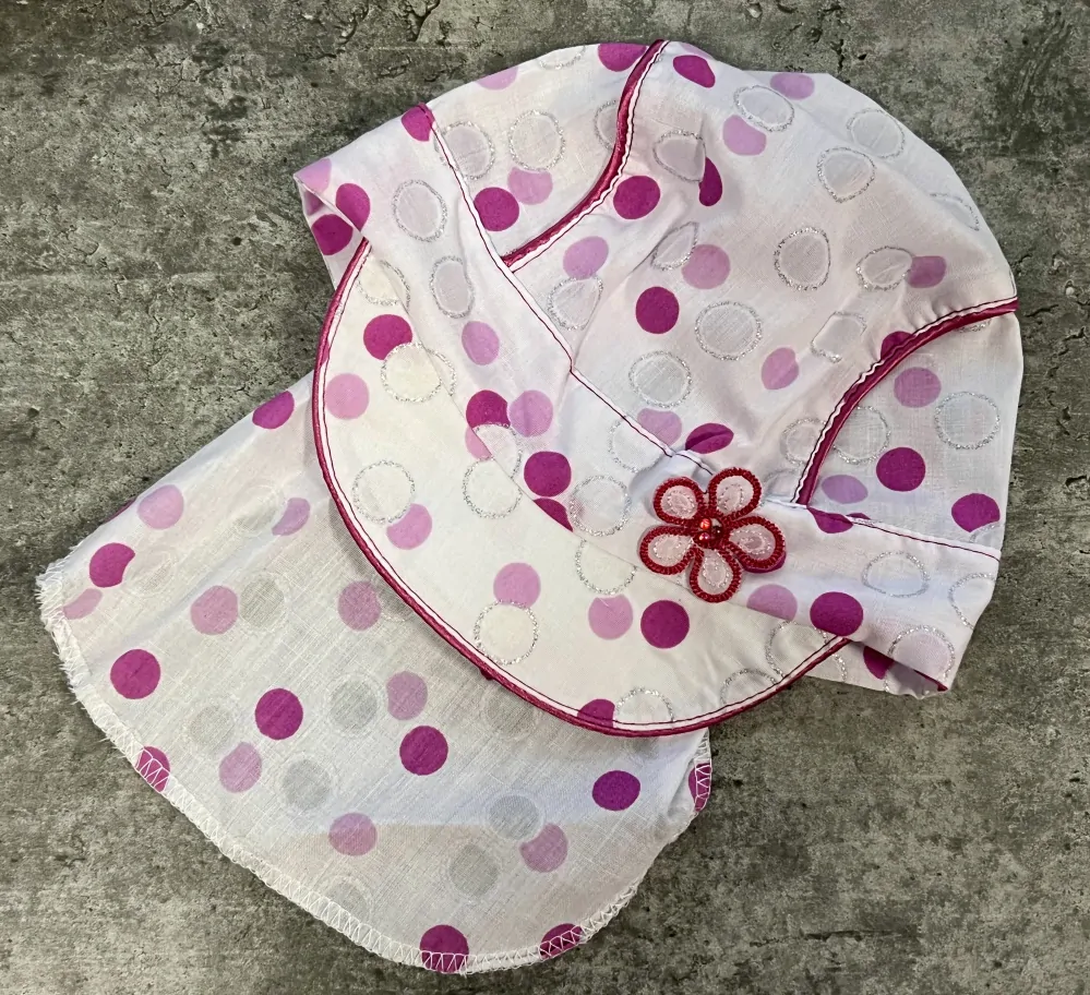 Letná dievčenská šiltovka z bavlneného plátna s krytím krku. Je biela a má potlač bodiek a strieborných koliesok. V zadnej časti je prúžok úpletu, vďaka ktorému sa čiapočka pekne prispôsobí hlavičke.