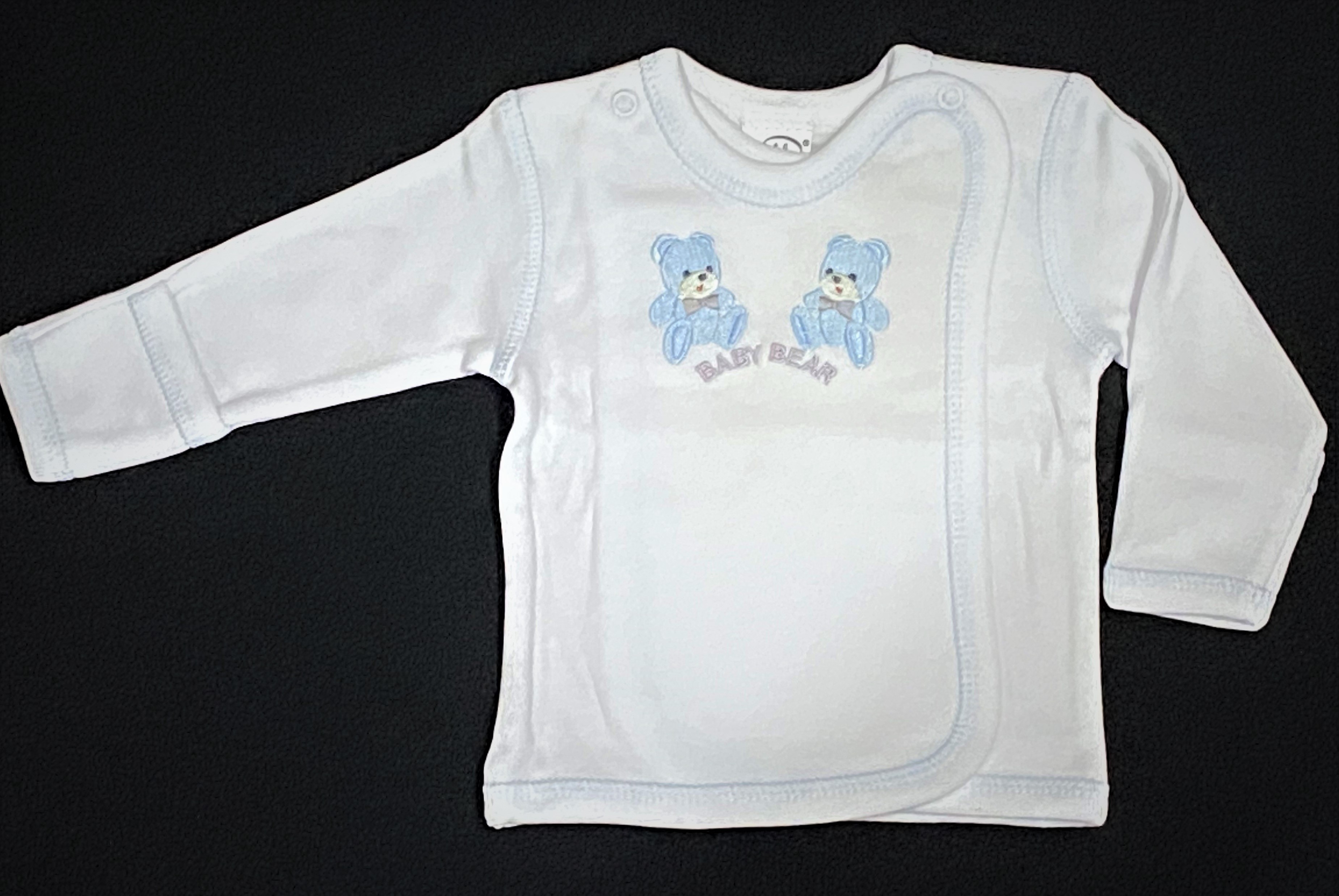 Bavlnená mäkká košieľka na preklad pre ľahšie obliekanie Vášho bábätka s nášivkou medvedíkov so zhrňovacím rukávčekom. Zapínanie je vyriešené dvoma patentkami.