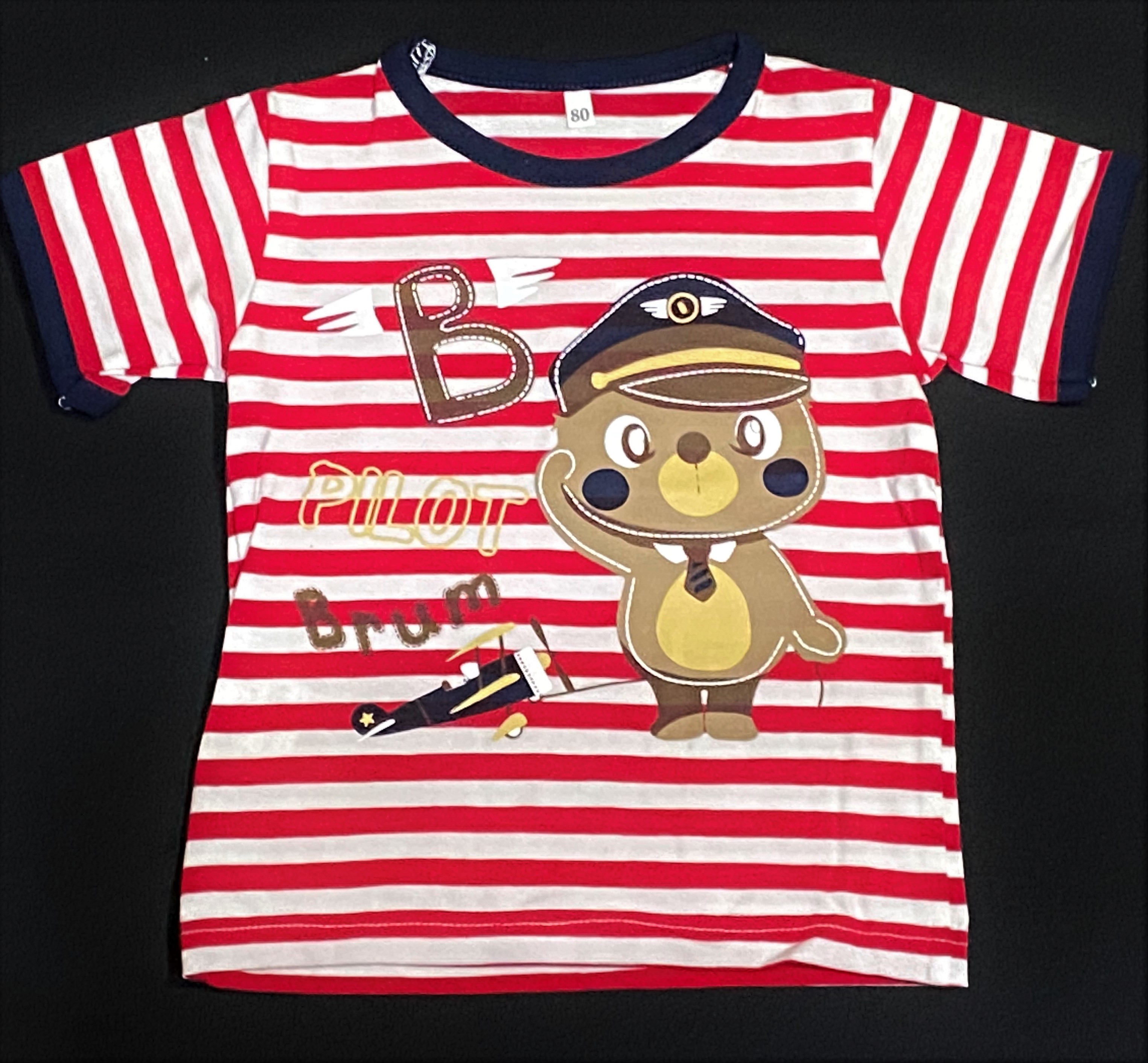Pruhované tričko s potlačou macka pilota. Jednoduchý rovný strih. Možnosť dokúpiť aj "Tepláky pruhované".